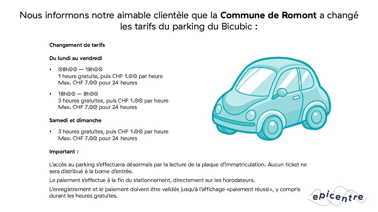 | Senior (dès 64 ans)/AI avec compte Epicentre - pisicne | CHF 1.50 / tranche de 15 minutes, maximum CHF 9.- / jour max. CHF 43.-/mois max. CHF 360.-/année |